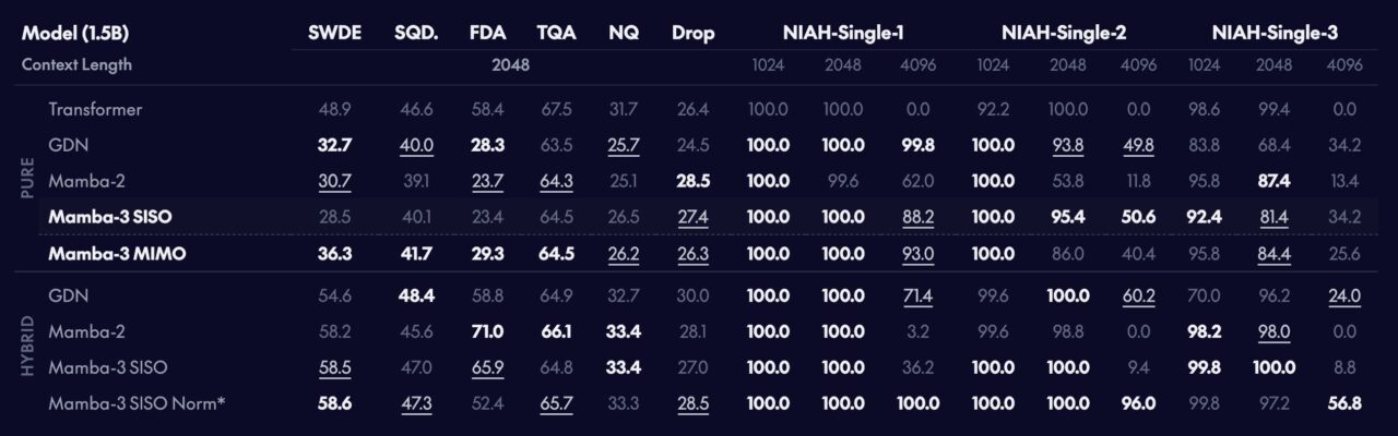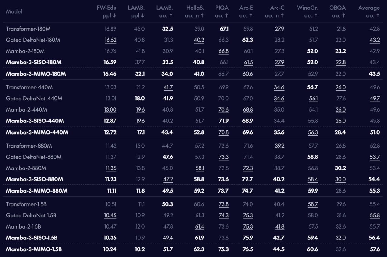 A MIMO (multiple-input multiple-output) formulation rounds out the trio, performing up to 4x more parallel mathematical operations per step by switching from outer-product to matrix-multiplication-based state updates. Because modern GPUs have far more compute capacity than memory bandwidth, MIMO exploits idle arithmetic units during decode without increasing latency. In practice, MIMO matches Mamba-2’s decode speed while delivering substantially stronger accuracy across all tested benchmarks.